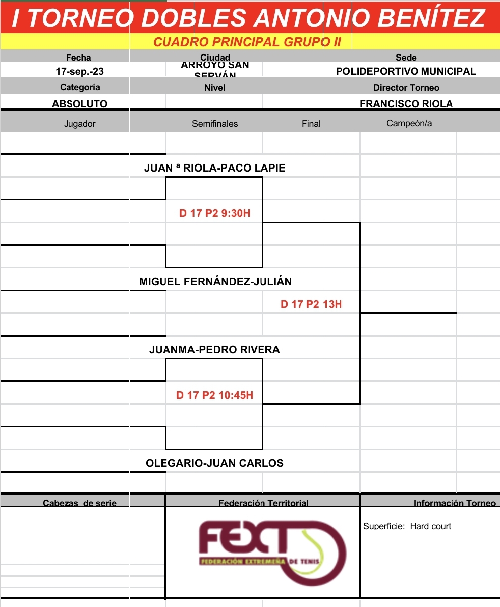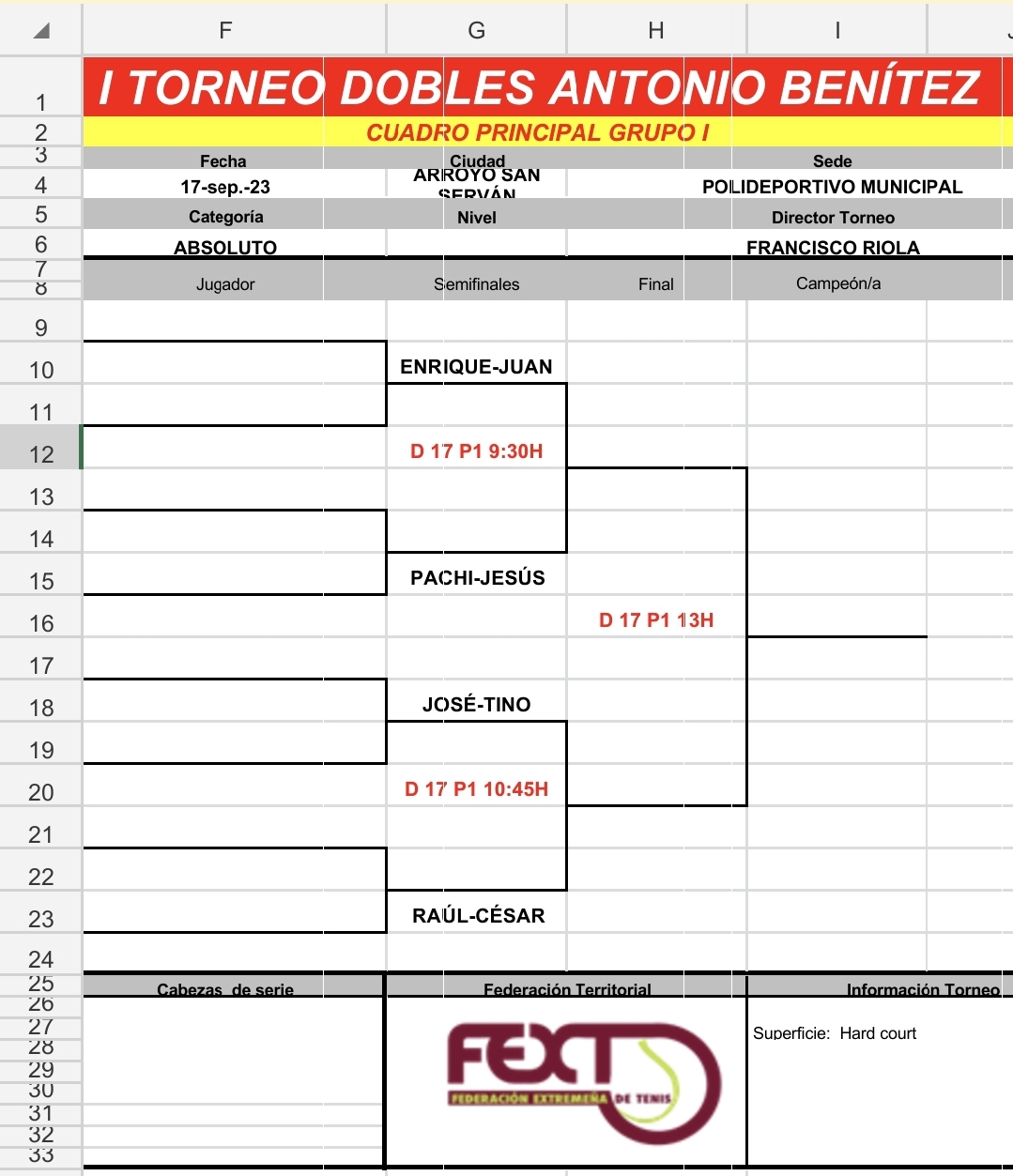 ESTE DOMINGO 17 SE DISPUTARÁ EL I TORNEO DOBLES ANTONIO BENÍTEZ, 8 PAREJAS 9:30H COMIENZAN LOS PARTIDOS Este domingo 17 de septiembre disputaremos el I TORNEO DOBLES ANTONIO BENÍTEZ. Hay 8 parejas divididas en dos grupos para que nos podamos divertir todos. Máximo dos partidos cada pareja. Sobre las 14h disfrutaremos de una convivencia. No os lo perdáis. Se agredece el esfuerzo de algunos jugadores que hace mucho tiempo no juegan pero que quieren homenajear al amigo ANTONIO BENÍTEZ. Se adjuntan los cuadros.