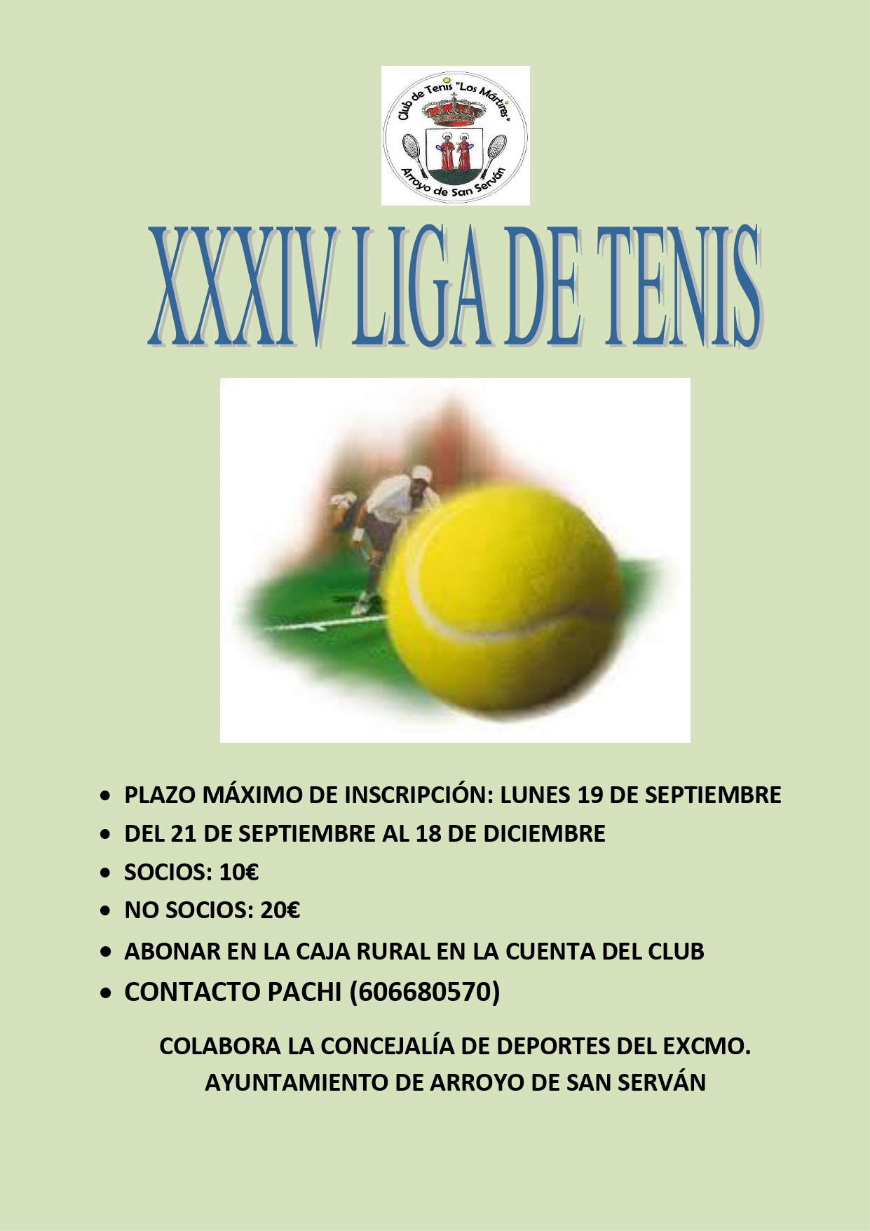 INSCRIPCIÓN LIGA XXXIV HASTA EL LUNES 19 DE SEPTIEMBRE CAMPEÓN TORNEO TALAVERA PEDRO REYES Comienza una nueva edición de la liga XXXIV. El plazo de inscripción es hasta el lunes 19 de septiembre. Socios: 10€ No socios: 20€ El ingreso hay que hacerlo en la cuenta de la Caja Rural del Club: ES60 3009 0017 7720 9151 7215 Juez árbitro: Pachi Animaros a participar!!!